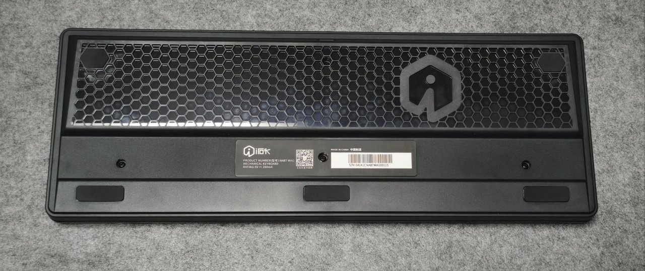 我们来看键盘的一个底部,可以看到它取消了常规的两段式脚撑,上部变成了蜂窝状结构。说实话,现在这么多厂商最多把设计点放在键盘的正面,并不太在意底层设计。当然肯定是有的,但是那些基本都是铝铊上或者四五百键盘的,价格低键盘的我还真没找到专门在背面做设计的厂家。当然,有人会担心他取消了两段式脚撑,那么整体手感如何呢?这个我觉得大家不用担心,因为他还特意做了一个凸起,键盘的角度达到了7°,这是一个黄金输入角度,非常适合我们打字或者长时间玩。